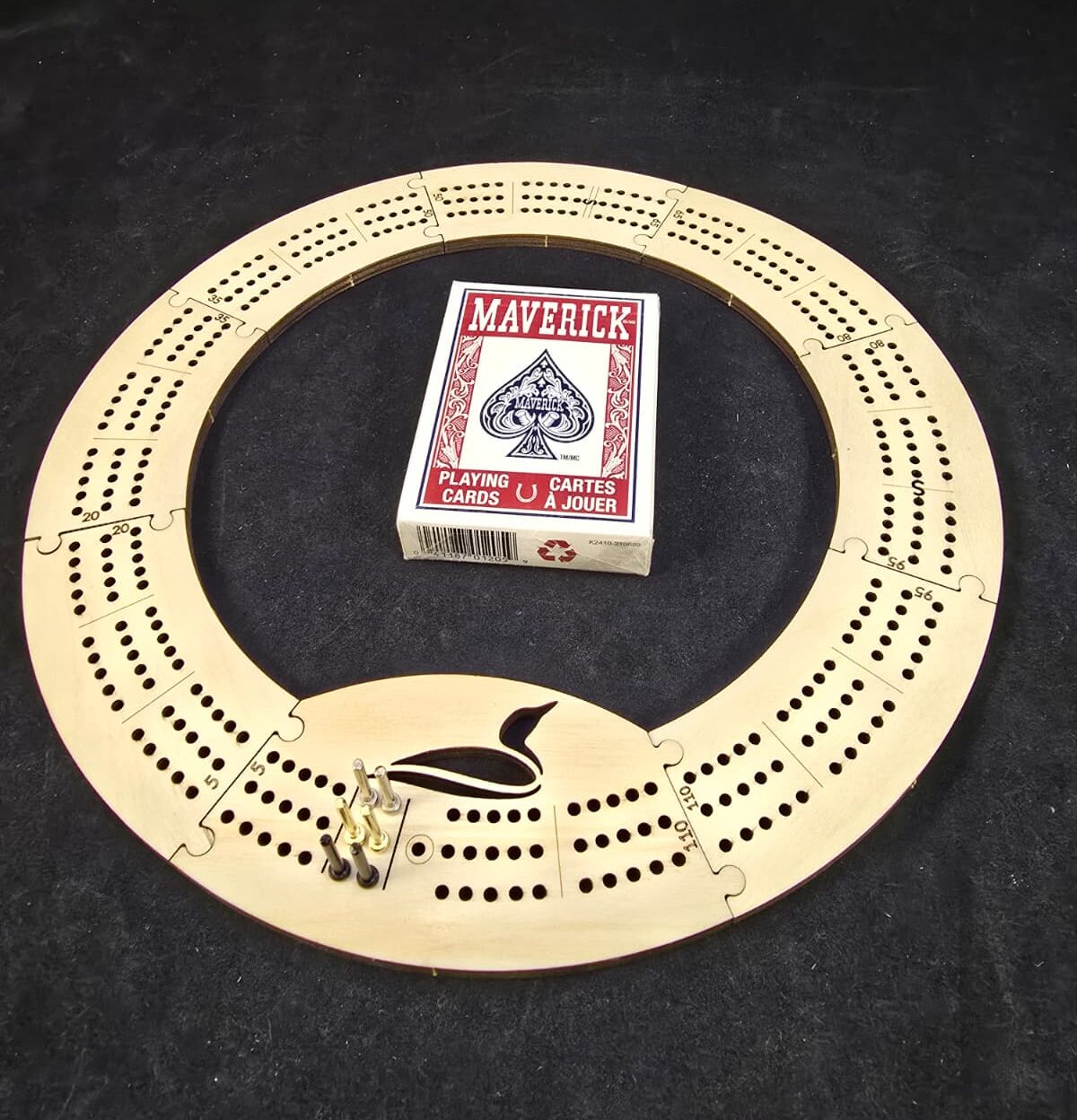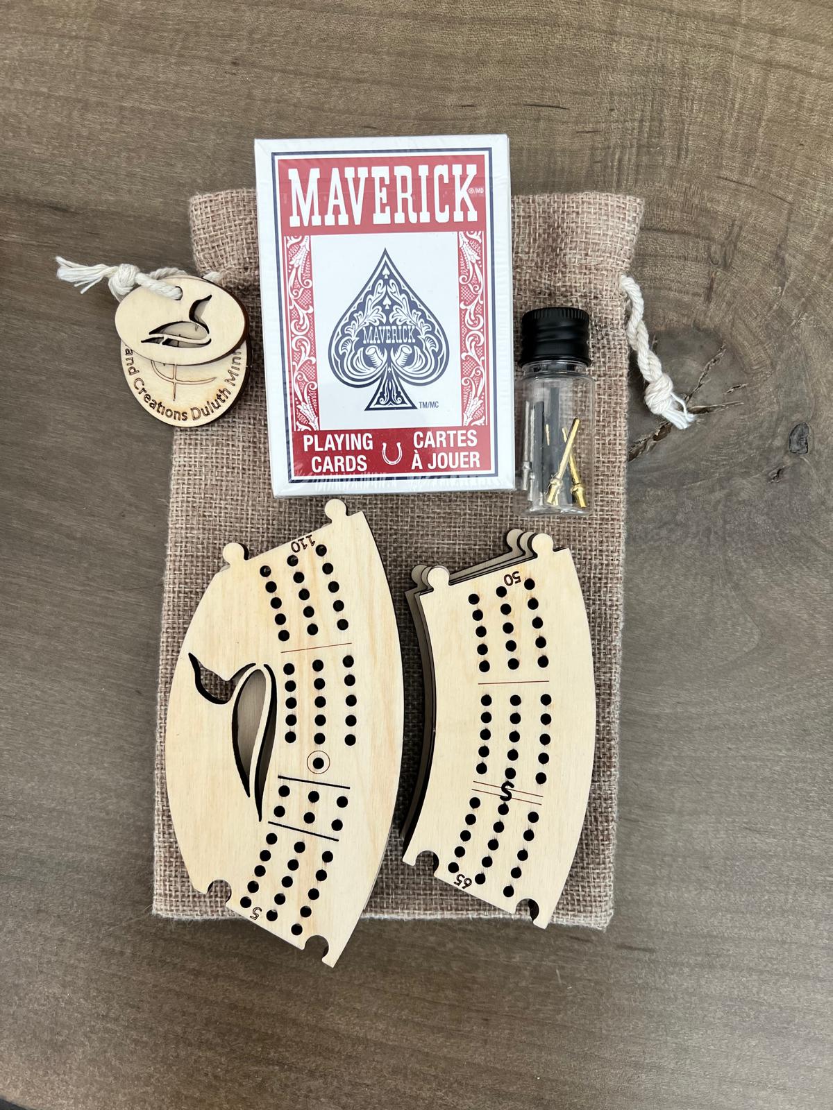In addition to the cribbage ring, each 5 x 7 burlap bag includes 9 (3 spare) nonstick metal pegs in 3 different colors stored in a clear plastic screw top vial and a deck of red or blue Maverick standard playing cards. Small enough to fit in your bag, backpack or coat pocket!
