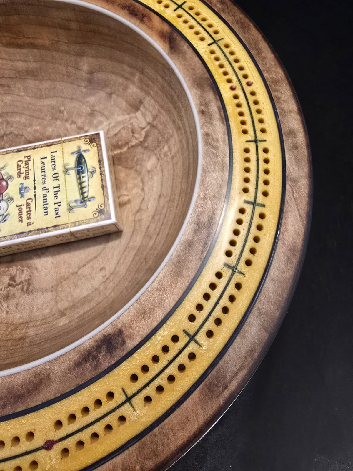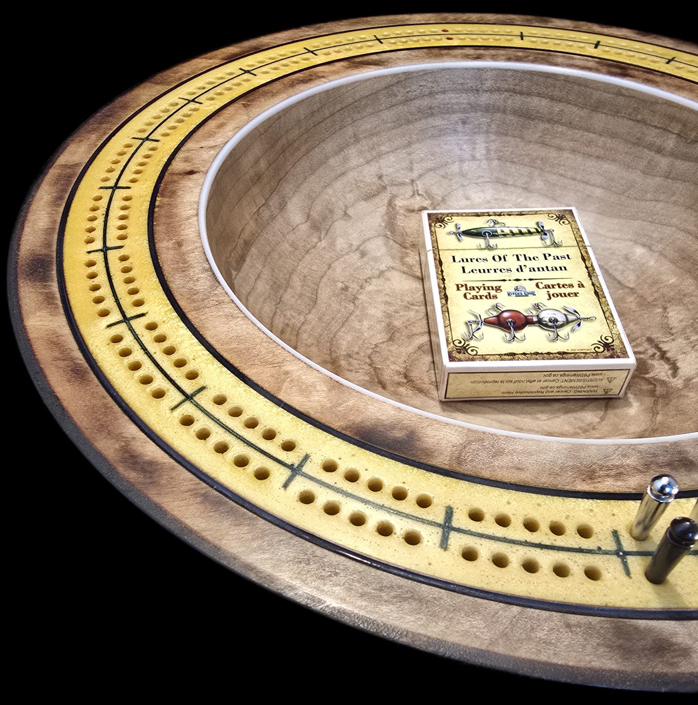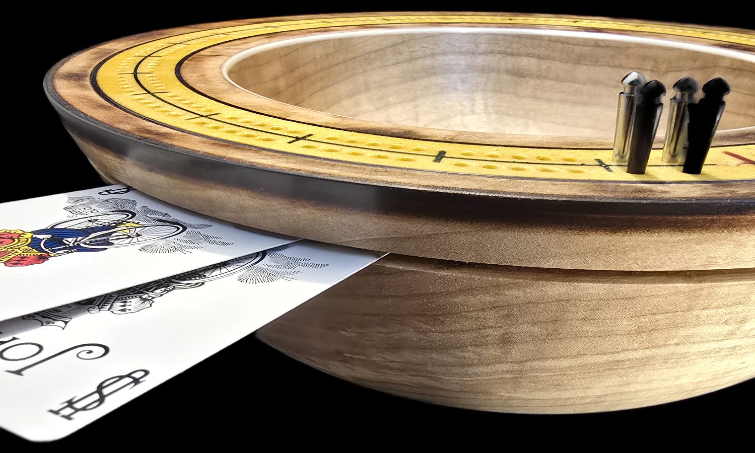 The beautifully grained bowl features two resin tracks accommodating two or four players paired. Decorative and functional card slot runs the circumference of the bowl enabling players to see each other’s cards over the bowl. Subtle white resin highlights the inner rim of the bowl while light burning of the wood enhances the antique feel. Unique bowl design is perfect for a coffee table display and can hold your crib or family game night snacks!