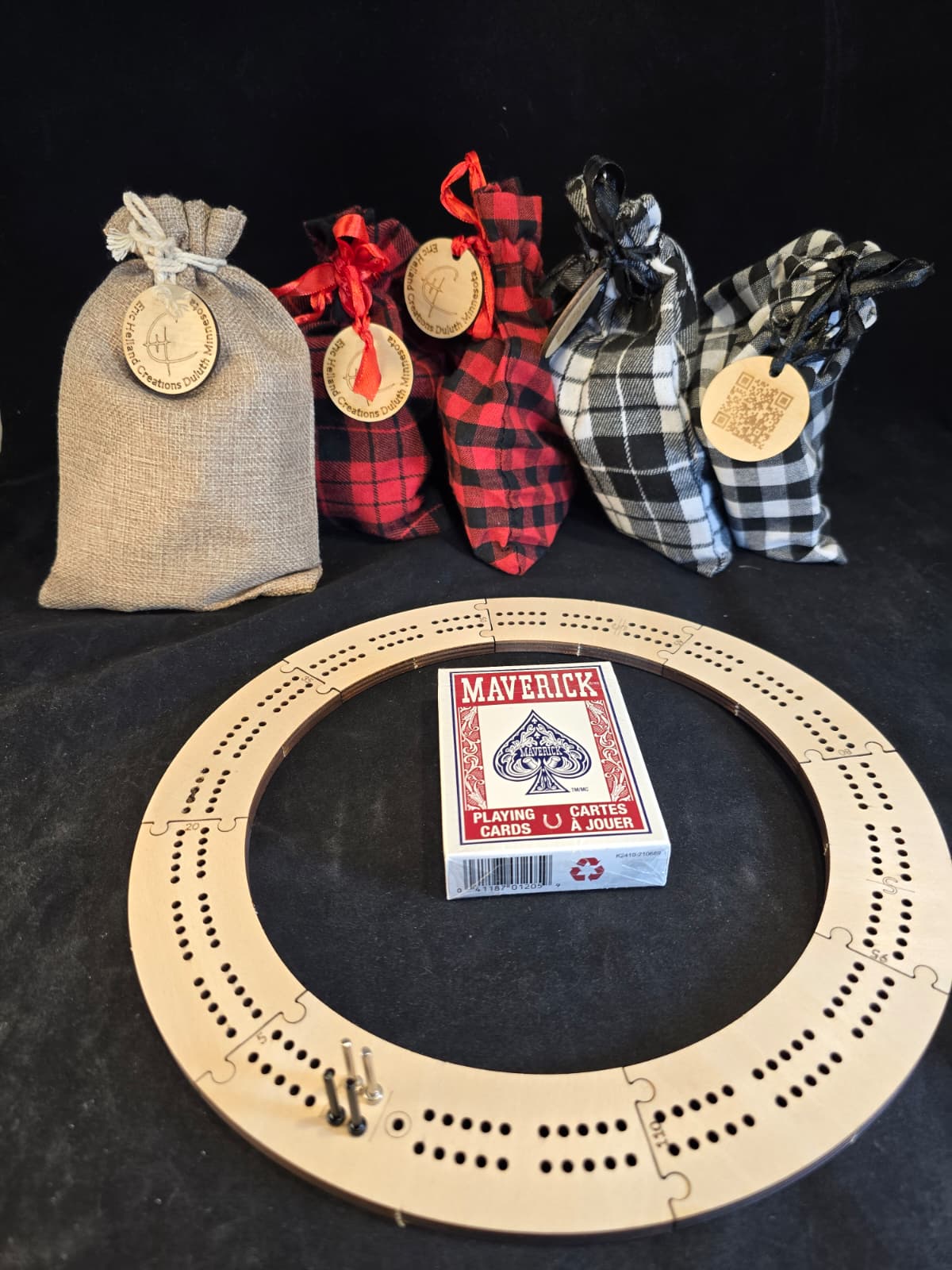 In addition to the cribbage ring, each 6 x 8 cloth bag includes 4 nonstick metal pegs in 2 different colors stored in a clear plastic screw top vial and a deck of Maverick standard playing cards. Small enough to fit in your bag, backpack or coat pocket!